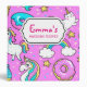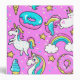 Pink Kitschy glittery funny unicorn and kitty cartoon illustration on a bright pink background with rainbows, ice creams and doughnuts