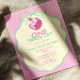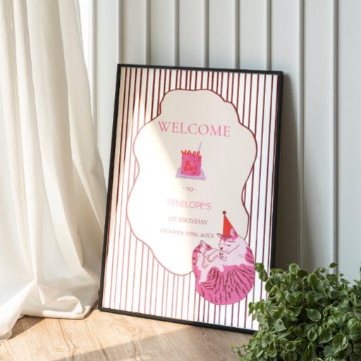 Celebrate a purr-fect first birthday with this adorable cat-themed invitation featuring a sleepy pink kitty in a party hat, a tiny birthday cake, and a sweet striped background with a vintage-style frame. The soft pink palette and playful wording make it extra charming for a little one’s big milestone.