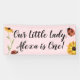 Decorate your ladybug theme birthday party with this adorable banner featuring a pink and white polka dot background and yellow flowers with ladybugs crawling.
