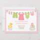 This cute Baby Shower invitation features a cute rubber duck and pink and green baby clothes, socks and bib on a laundry clothesline. This modern and elegant shower invitation is perfect for any mom to be.