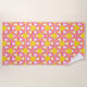 This beach towel has a geometric design of repeating pink and orange triangles with yellow circles on top on a field of off-white. Want the same design in different colours? Message me.