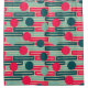 This shower curtain has a mid-century modern design of repeating rectangles in pink, teal, and blue with circles layered on top.