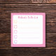 This simple pink to do list sticky notepad can be personalized with a name for a thoughtful gift. It is a small square 3x3 sticky notepad with shades of pink text and lines on a white background with an pink border. You can change the text that says "To Do List" to some other type of list if you wish. There are check boxes next to each line that can be ticked as each task is completed.
