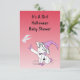 This adorable range of It's A Girl Halloween baby shower invitation cards are as cute as they come. The light red invitation cards offer a little baby witch dressed in pink gloves, booties, neckerchief and a pink witches hat pointing at a little friendly bat as the central image on the card, the lettering has been set to black and is positioned to the top of card. Flip the card over to the back to find full party information details and the same little witch image sitting to the right of the card. All the wording on both the front and back of the invitation card can be personalized with your own Halloween baby shower party details.