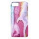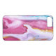 A phone case with an abstract design featuring a blend of pink, white, blue, and gold colours. The design has a marbled effect, with the colours swirling and blending together. The pink shades range from light to dark, creating depth and dimension. The white adds brightness and contrast, while the blue provides a cool accent. The gold accents add a touch of luxury and shimmer. The overall effect is modern and artistic.