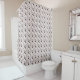 Herringbone pattern design shower curtain in shades of soft pink, mauve, and brown with white.
