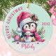 This girly pink and mint green ornament with a cheerful penguin in pink Santa hat and scarf is easy to personalize with any name and a year. The name template is in a script calligraphy font to add elegance to this keepsake for girls who love penguins, pink colours and cute designs.