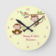 This pink and yellow wall clock is perfect for little sisters that share a bedroom. Complete with adorable girly monkeys and Personalized with their names.