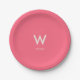 Trendy personal party paper plates featuring pink background, large centred monogram and associated name. Clean, simple minimalist typography. Fully personalizable.