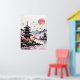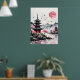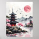 This painting depicts a dramatic Japanese landscape under a large, glowing pink moon. A multi-tiered pagoda stands on a rocky island, with a smaller pagoda visible in the misty distance. Cherry blossom petals are scattered on the water and ground, adding to the romantic atmosphere. A flock of black birds flies across the moonlit sky, creating a sense of movement and depth.