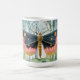 A delicate Pink and brown moth against the background of a blue and green mysterious forest.