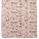 Charming seamless pattern shower curtain featuring the word Nurse with medical essentials like stethoscopes, syringes, medicine bottles, and nurse cups on a soft pink background. This playful healthcare-inspired design blends feminine colors with nursing-themed elements, making it ideal for nurses, nursing students, healthcare workers, and medical professionals.