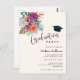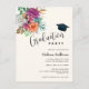 Graduation invitation with a flower arrangement containing pretty pink, orange and white roses surrounded by green leaves.
