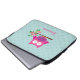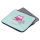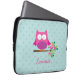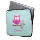 Personalized laptop sleeve featuring a little pink cartoon owl sitting on a branch with green leaves and hot pink flowers and aqua polka dots. Cute and fun design for for girls. Customizable name gift.