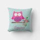 Personalized pillow featuring a little pink cartoon owl sitting on a branch with green leaves and hot pink flowers. Customizable name. Fun design for girls. Ideal for customizable gifts.