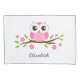 Cute, personalized pillowcase for girls featuring a pink owl sitting on a branch with green leaves and pink flowers. Customizable name or other short text.