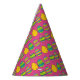 Paper party hat design features an original marker illustration of a row of painted Easter eggs, printed on a pink background.