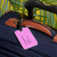 Features a pink tropical palm leaf design. Personalize with a name on the front, and a name and address on the back.