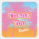 Pink "Thank You" party favour sticker is a fun addition for a bachelorette party with the bride to be's name underneath. The background is colourful with blue and yellow and pink palm trees.
