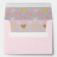 A full -bodied pink with slight texturing paper image was used for this envelope, the store option pink being just a soup song too pale for my valentines this year. This envelope is lined with fun watercolor hearts in blush, pink, and various shades of gold, all over silver grey.