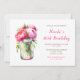 Beautiful birthday party invitation with pink peony flowers in a mason jar. Perfect for a birthday party. The words can be changed to suit your own details or requirements