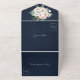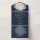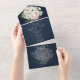 A gorgeous bouquet of pink Peonies against a navy background creates an outstanding contrast on this wedding invitation.