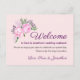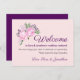 This wedding welcome card features a watercolor graphic of blooming pink peonies. The background is light pink with the backside a solid dark purple. Custom text allows you to add a personal welcome to our wedding message.