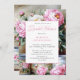A romantic still life of blooming peonies sets the tone for celebration and elegance for this bridal shower invitation. Three vintage-style tin cans, adorned with soft floral patterns, cradle lush pink and white peonies in full bloom, with delicate buds and verdant leaves spilling gently across a wooden surface. The central bouquet radiates warmth and charm, while scattered blossoms and a softly painted floral backdrop evoke timeless beauty. This graceful composition invites guests to a bridal shower filled with love, laughter, and floral enchantment. The back of the card is a full version of the beautiful floral illustration. Personalize with your own information.