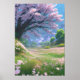 A brilliant field of pink flowers stretches as far as the eye can see in this piece of digital art, which transports us to a peaceful and gorgeous scene. A gigantic cherry blossom tree stands in the heart of this vibrant display, its delicate petals contributing to the scene's attractiveness. We are invited to take a leisurely stroll through this picture-perfect springtime paradise by the soft green grass beneath our feet.