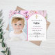 Add your own vertical size photo. A pink arch shaped photo frame. A white background colour. Decorated with pink flowers and a golden cross. Personalize and add a name and details.