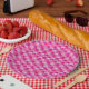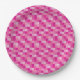 This party paper plate features squares in different shades of pink in a pixelated pattern resembling 16 bit graphics in popular video games.