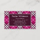 This elegant and modern business card features a pink, black and white plaid background. The text combines modern sans serif fonts for a classy and sophisticated look.