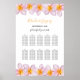 This design features pink frangipani / plumeria flowers. A tropical design elegantly framed with pink frangipani flowers. The bride's and groom's names are emphasized with an orange color chosen from the center of the plumeria flower. These popular tropical Hawaiian flowers are ideal for an elegant destination beach wedding. Tropical wedding seating chart design with modern elements. Matching wedding invitations and other stationery items are also available.