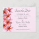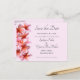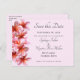 Pink plumeria save-the-date custom postcard in pale pink with realistic flowers. Beautiful Hawaiian flowers, called frangipani or plumeria, make a wide border along the left side. Text is off-centre and is easy to personalize line by line. Include mailing address and return address on the back, or delete to order blank.