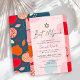 This stylish and kitsch Bat Mitzvah invitation features a pink background with a pomegranate pattern in red, orange and navy blue. The reverse side features a navy blue background with a pomegranate pattern. Personalize it for your needs. You can find matching products at my store.