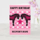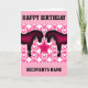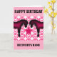 Cute pink pony personalized Birthday card for a girl. This pink pony Birthday card has a pink and white horse shoe pattern, with love hearts inside each horse shoe. There are two large pink ponies and a star.
