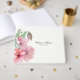 Pretty white wedding guest book with watercolor artwork of pink poppies. Personalize the black text for your special day.