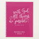 A modern typographical Christian planner featuring the Bible verse Matthew 19:26 With God all things are possible" in white whimsical script font, personalized with your name and year at the bottom. The background colour is in bright pink, which can be edited.