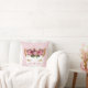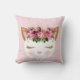Pink girl's throw pillow with graphics of a cute round white kitty face complete with pink heart shaped nose, big golden eye lashes, golden glitter looking ears and pink flowers on it's head. Customize to add your own text. Cute gift idea for any age girl or cat lover.