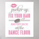 Add a fun and flirty touch to the wedding bathroom with this playful Pucker Up, Fix Your Hair and Get Back on the Dance Floor display in bold pink and grey typography with a lipstick kiss and hairbrush illustration. The cheeky message and retro-inspired mixed type create a lighthearted, festive vibe perfect for the reception restroom. A fun conversation piece guests will love. No customization needed.