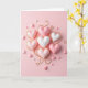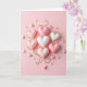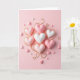 This greeting card shows a still-life arrangement of puffy hearts set against a soft blush pink background. At the center, larger hearts in white and light pink sit close together, with smooth, glossy surfaces that resemble sweet treats. Some of these hearts rest inside thin gold wire heart outlines that overlap slightly, adding an elegant contrast. Smaller hearts in matching shades are scattered around the main group, as if they gently drifted into place. Soft, even lighting creates light shadows that make the hearts feel rounded and warm. With no text on the front, the colors and shapes share the message on their own. It’s a lovely choice for Valentine’s Day, anniversaries, or a heartfelt note to someone special ❤️