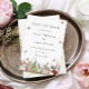Feminine and classic, this save the date invitation features a lovely garden of watercolor pink and purple flowers including roses, tulips, lavender and eucalyptus greenery with bright coloured butterflies and bumble bees flying around.