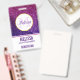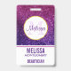 Name badge with a fancy and elegant design. The background composed of pink and purple sparkling glitter gemstones. Trendy and feminine vibe. A circle with a faux-gold-foil border layered over top with your name and initial inside.