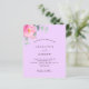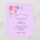 A violet, lilac coloured background. Decorated with a pink floral, rose flower and green watercolored eucalyptus leaves, sprigs, greenery and faux gold sprigs. Personalize and add your names and wedding details.