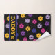 Vibrant pink, yellow and purple on black pickleball pattern, custom text hand towel. Perfect as a gift for pickleball player. Customizable text.