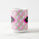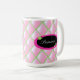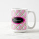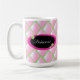 Pretty pink and green quilted diamond pattern. 3d diamonds. The word 'princess' accents each side of mug.