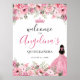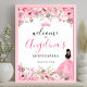 This lovely sign features a whimsical pink floral garden theme with pink roses and peonies, perfect for welcoming guests to your special day. The design showcases vibrant blooms with lush greenery, complemented by a sparkling tiara worn by a girl in a pink dress. "Welcome" is displayed in a mix of elegant script and bold serif fonts in black and vibrant magenta pink, blending fun and sophistication. The matching Thank You sign on the back continues the floral theme, making it great for budget-friendly use. Customize the font colors and background to match your style. For a brighter look, simply adjust the transparency layer to enhance the vibrancy of the flowers. This beautiful sign adds a touch of elegance to your Quinceañera celebration, creating a lasting impression for your guests.