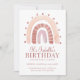 A sweet pink and rosy brown boho style rainbow kid's birthday party invitation. A modern sweet style contrast of script and serif coloured type. Simple and whimsical.
