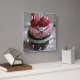 A photo of a delicious chocolate cupcake with pink frosting. Two raspberries rest on top. A delicious sweet dessert, who can resist?