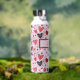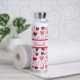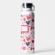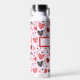 This water bottle features a fun pattern that consists of pink, red and black patterned hearts, stars, polka dots and the word love in a pretty script.